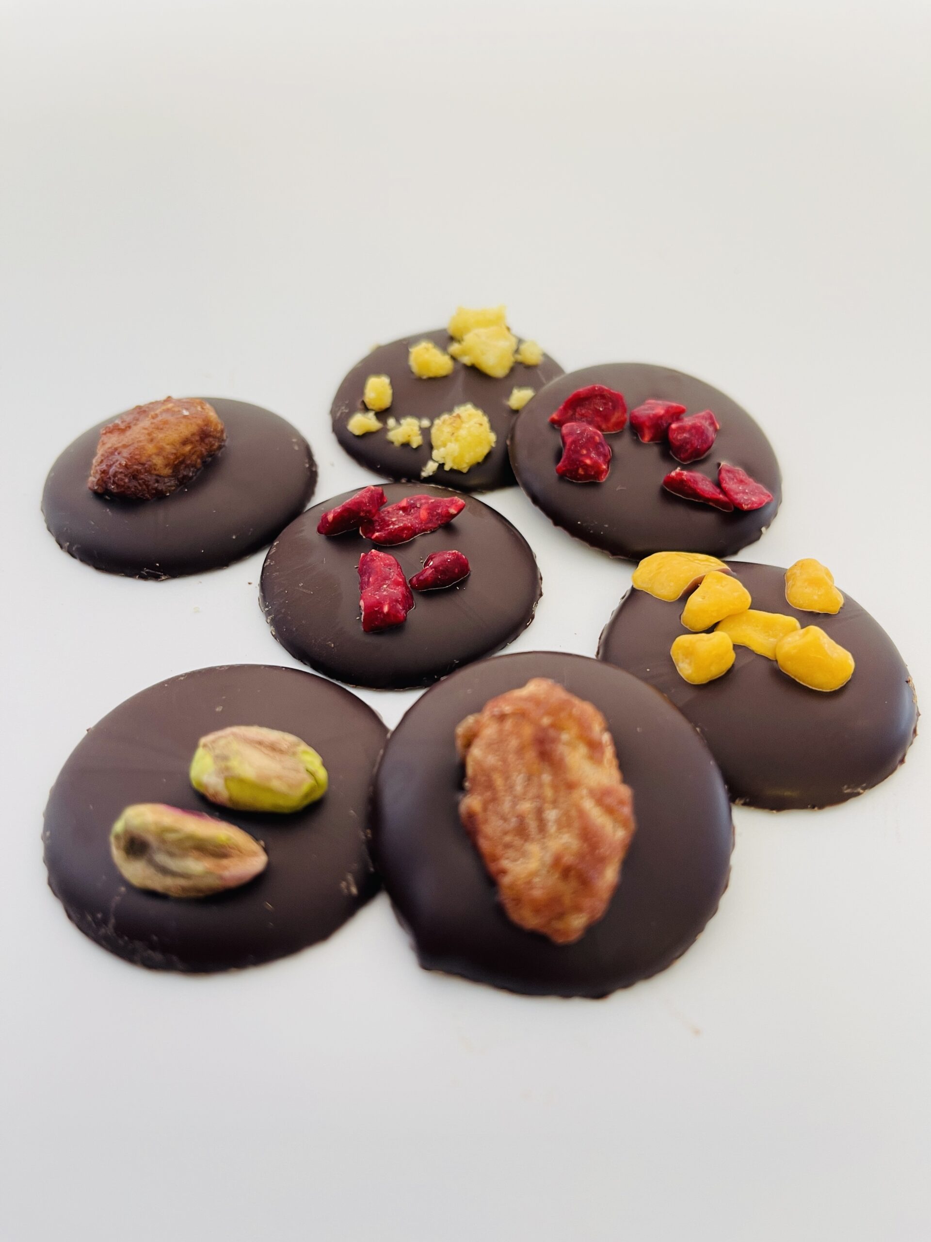 – aus unserer neuen Kollektion – unsere Schokoladen Taler bestreut mit Früchten oder Nüssen.