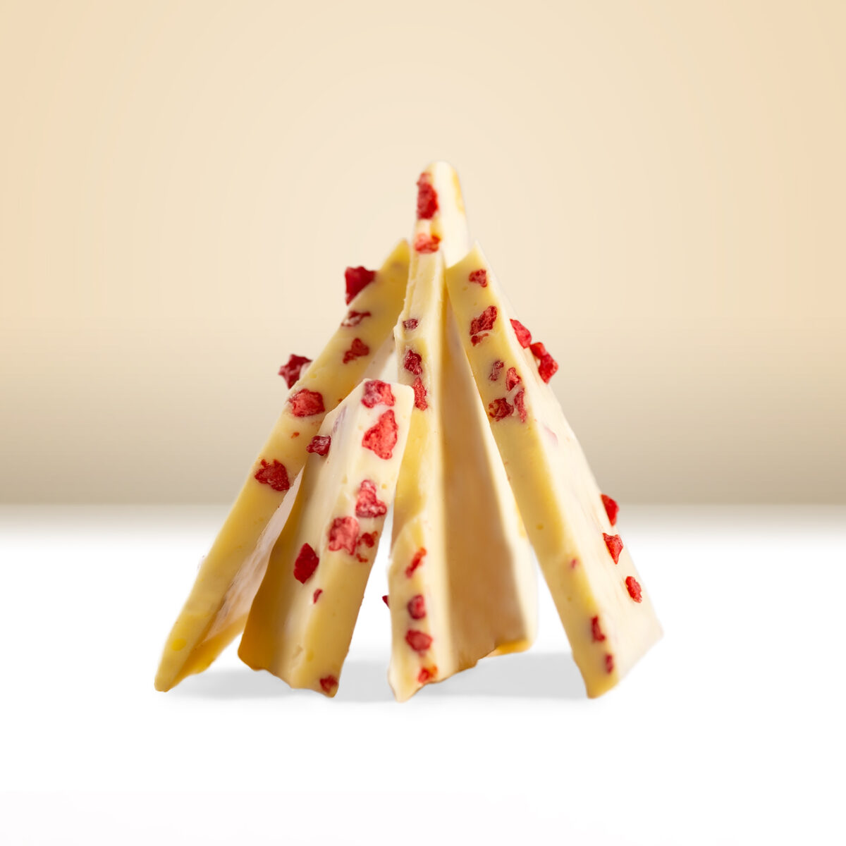 Feinste weiße Schokolade mit fruchtigem Erdbeercrisp verfeinert.
