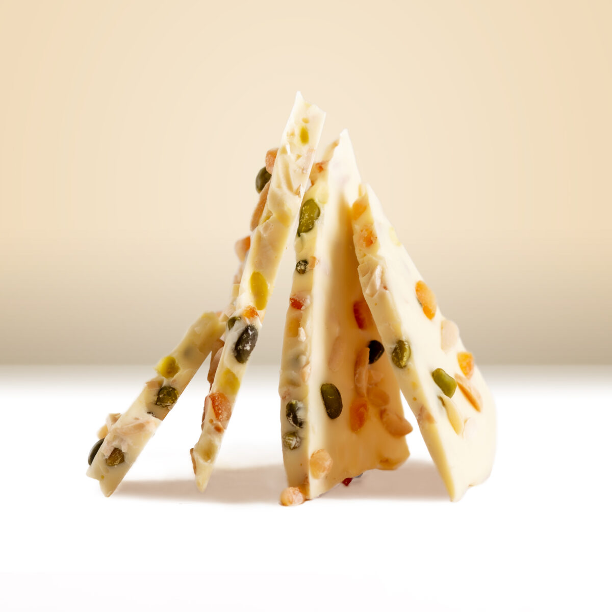 Weisse Schokolade mit ganzen Pistazien aus Bronte, fruchtigen kandierten Orangen und Marcona Mandeln verfeinert.