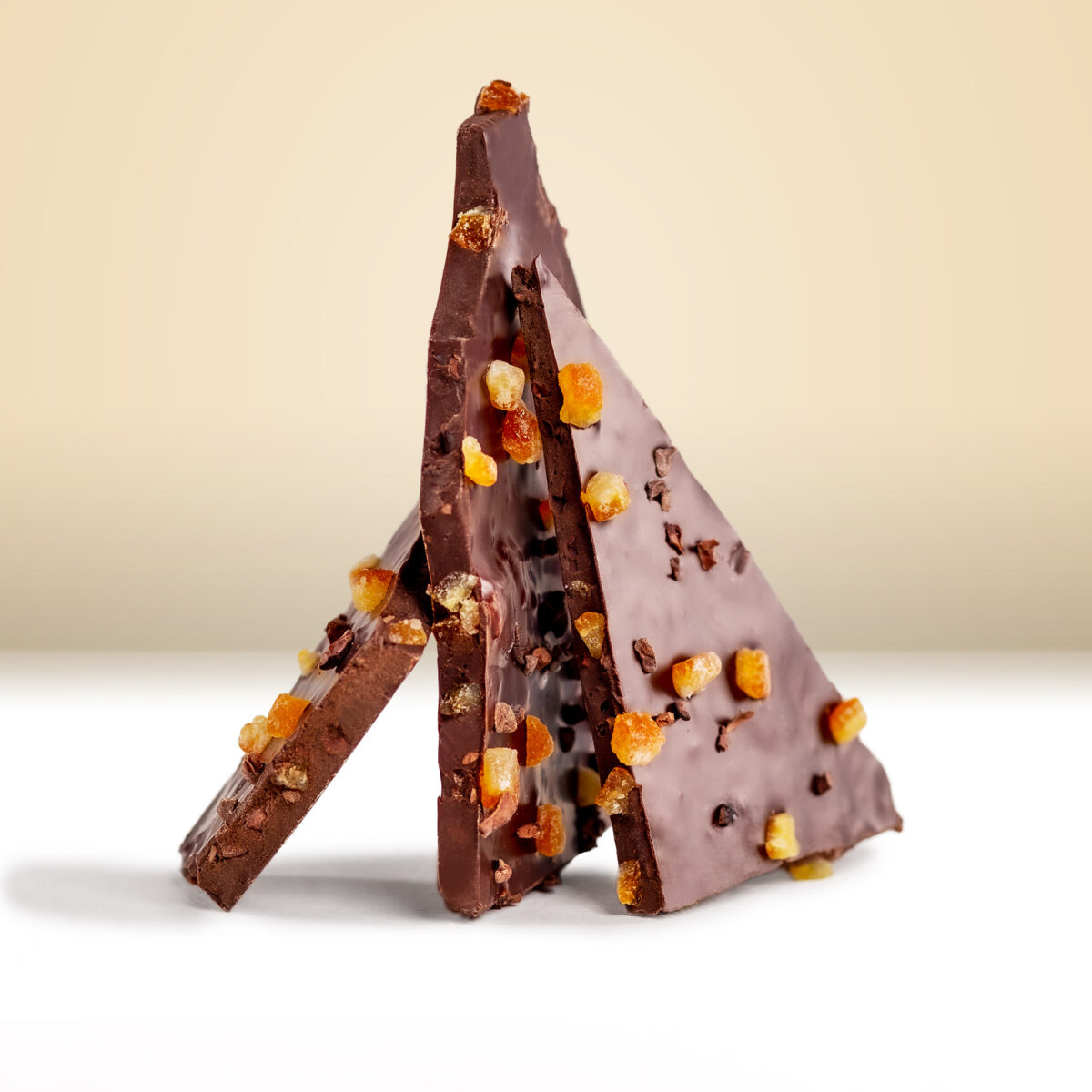 75% Zartbitter Schokolade mit kandierten Valencia Orangen und Kakaosplitter verfeinert.